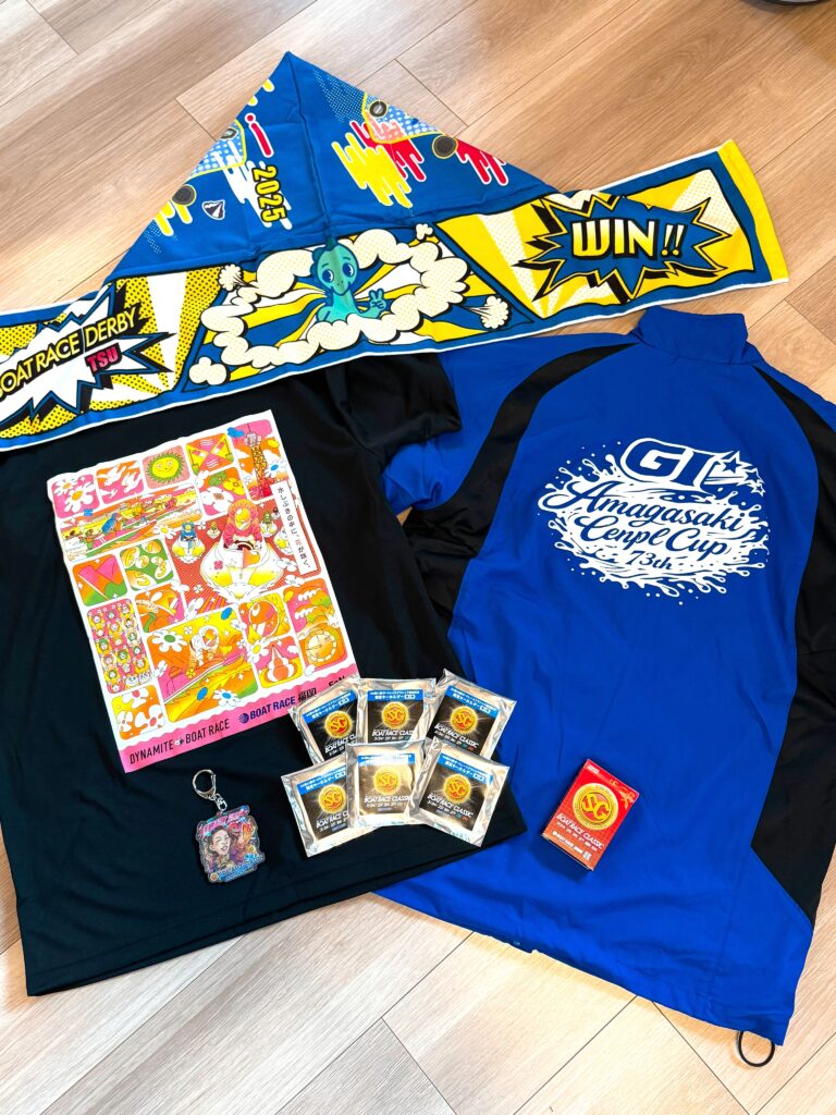 尼崎で頂いた中がフリース素材のジャンパー1着、福岡で頂いたTシャツ(L)1着、妻からの提供で蒲郡クラシックで頂いたキーホルダー6個、トランプ1個、去年のダービーのフード付きタオル1枚の計10点をグッズを購入していただいた方へ先着で10名の方へ、商品と一緒に同包して発送させていただきます‼️ (プレゼントの品はこちらでランダムに決めさせていただきますのでご了承ください…🙇♂️ なくなり次第終了となります。)